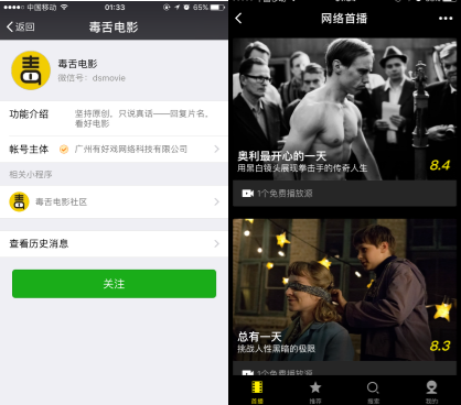 左為公眾號(hào)介紹頁;右為公眾號(hào)主體開發(fā)的小程序