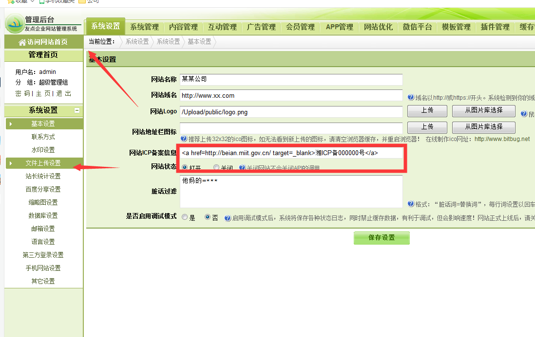 *:打開后臺網(wǎng)址進(jìn)入系統(tǒng)設(shè)置-基本設(shè)置 如下圖頁面,在箭頭地方添加如下代碼: