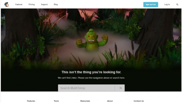Mailchimp是一個(gè)非常流行的電子郵箱營(yíng)銷平臺(tái)。在它的404錯(cuò)誤頁面,Mail Chimp使用了一張猩猩在森林中的背景圖片,似乎在暗示訪客已經(jīng)迷路了。進(jìn)入這個(gè)頁面的訪客可以在插圖的幫助下更加清晰地明白它的信息。*棒的地方在于Mail Chimp在頁面的下方提供了一個(gè)搜索框,訪客可以在這搜索任何自己感興趣的內(nèi)容。如果搜索框在查找或定位資源方面還不夠給力的話,訪客還可以使用搜索框下方的導(dǎo)航菜單。