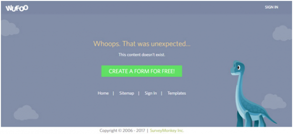 Wufoo是一個(gè)幫助人們?cè)诰€創(chuàng)建獨(dú)特表格的網(wǎng)站。在Wufoo的404錯(cuò)誤頁面上,綠色的按鈕(免費(fèi)創(chuàng)建表格)很是顯眼,背景圖片中還有這一只恐龍正在直勾勾的盯著行為引導(dǎo)按鈕,這無形之中又給了訪客暗示,訪客更有可能點(diǎn)擊這個(gè)按鈕。除此以外,Wufoo還將可選的菜單項(xiàng)放在了行為引導(dǎo)按鈕的下方,給訪客提供多種選擇。