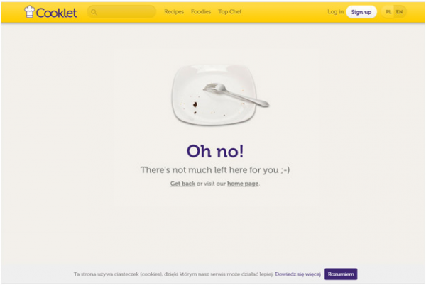 Cooklet是一家全球美食食譜分享網(wǎng)站。它在自己的404頁面上放了一張空盤子的照片,這個(gè)插圖很直觀,也與網(wǎng)站的主題相呼應(yīng)。Oh no!的話語更有感情色彩,能夠引起用戶的情感共鳴,*有意思的地方是Cooklet在網(wǎng)站上放置了返回以及回到主頁的鏈接。除此以外,它們還將導(dǎo)航菜單、搜索框放在了頁面的上方,便于用戶重新定位資源。