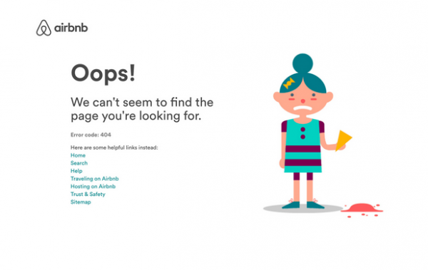 雖然訪客在404頁面沒有及時(shí)獲取想要的內(nèi)容,但這并不是瀏覽體驗(yàn)的終點(diǎn)。在訪客走進(jìn)死胡同時(shí),我們可以給他們以指引,在404頁面提供一些相關(guān)內(nèi)容的鏈接,就像下圖Airbnb在404頁面放置了"主頁"、"幫助"、"查找"等諸多選項(xiàng),讓用戶有"柳暗花明又一村"的感覺。沒準(zhǔn),用戶能在其他頁面找到自己想要的信息,又或是對(duì)某個(gè)頁面產(chǎn)生興趣,從而在網(wǎng)站上停留更長(zhǎng)時(shí)間,這不就是我們想要達(dá)成的目的嗎?