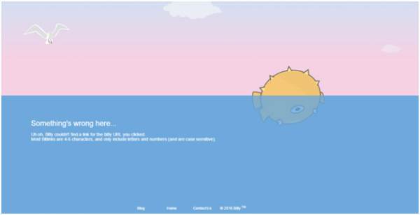 Bitly是一家提供縮短URL服務(wù)的網(wǎng)站。下圖就是它的404錯(cuò)誤頁面,很美觀,也富有深意。如果你仔細(xì)觀察一下它的錯(cuò)誤頁面,你會(huì)發(fā)現(xiàn)設(shè)計(jì)師將海洋設(shè)計(jì)成空無一物的,這其實(shí)是在暗示網(wǎng)頁里什么都沒有,能給訪客提供一個(gè)更加直觀的感受:在這沒有想要的資源。Bitly同樣也在頁面的底部放置了導(dǎo)航菜單。另外,為了讓網(wǎng)站上的各種元素更具有互動(dòng)性,Bitly的設(shè)計(jì)團(tuán)隊(duì)還將海洋設(shè)計(jì)了波浪的動(dòng)效,海鷗也是可以揮動(dòng)翅膀的,你可以來這個(gè)網(wǎng)站親自感受一下。